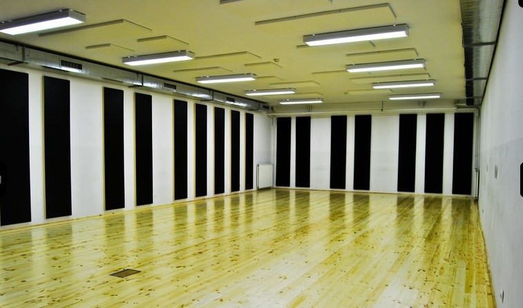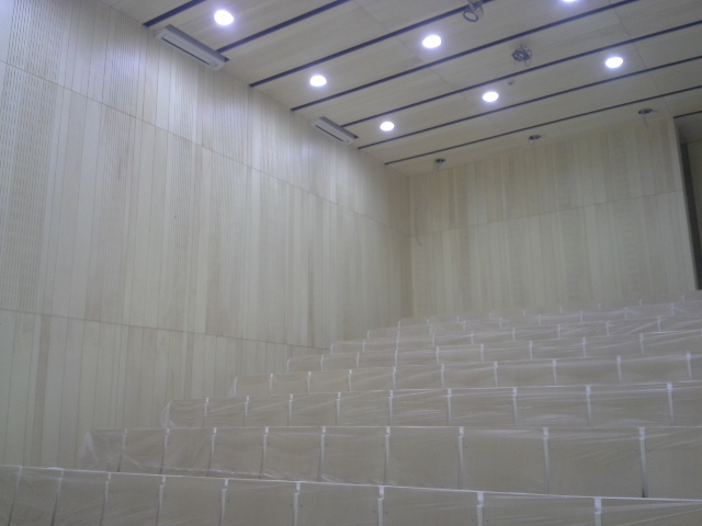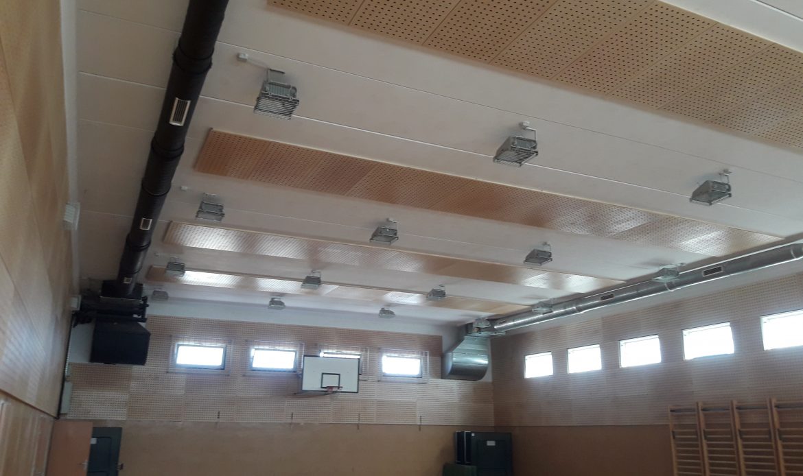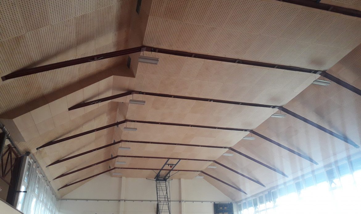 V dvorani smo uredili akustično ureditev s stropno akustiko. Uporabili smo vezano ploščo, barvano s težko gorljivim lakom.