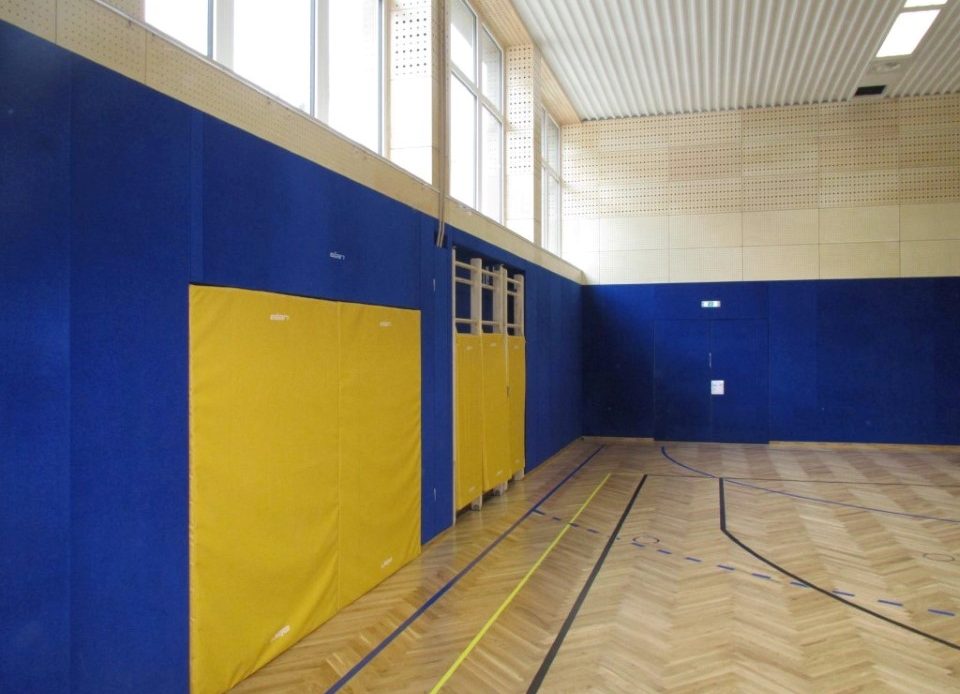 V športni dvorani smo montirali Elanovo Športno opremo, obenem pa smo poskrbeli tudi za boljšo akustično ureditev dvorane. Od materialov smo uporabili vezano ploščo, premazano s težko gorljivim lakom.