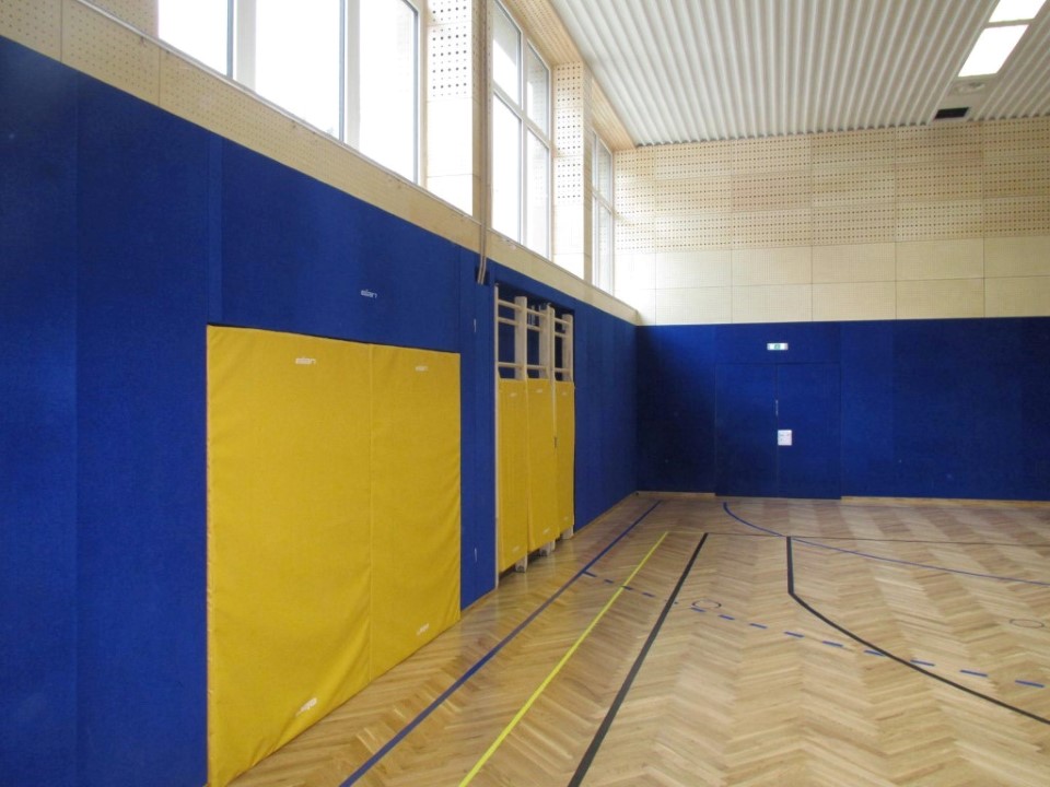 V športni dvorani smo montirali Elanovo Športno opremo, obenem pa smo poskrbeli tudi za boljšo akustično ureditev dvorane. Od materialov smo uporabili vezano ploščo, premazano s težko gorljivim lakom.