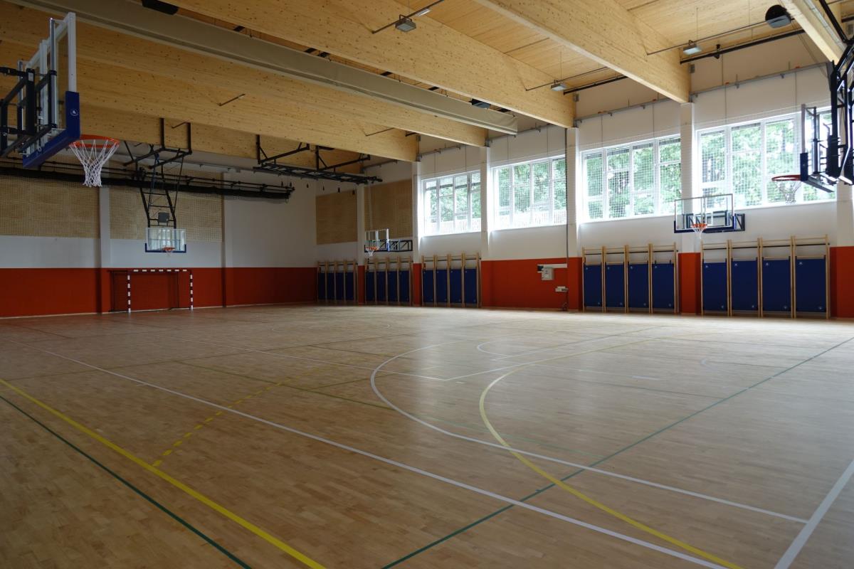 V športni dvorani je bilo potrebno urediti akustiko. Za to smo uporabili vezano ploščo, ki smo jo prebarvali z težko gorljivim mat lakom.